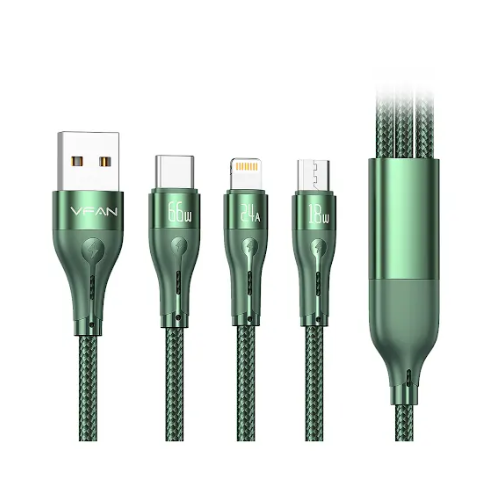 يعد كابل VFAN 3 في 1 الخيار المثالي للمشترين التجاريين الذين يحتاجون إلى حلول شحن متعددة الأجهزة. يدعم الكابل Micro USB، USB-C، وLightning، مما يجعله مثاليًا لشحن الهواتف الذكية بنظام Android، أجهزة آيفون، والتابلت.